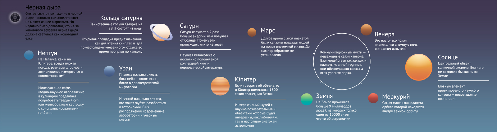 Павильоны каньона соответствуют планетам в Солнечной системе, и каждый павильон-планета предназначен для пространств, в которых сейчас нуждается планетарий. Кто, если не они, знают, что нужно: клуб любителей астрономии сейчас, например, ютится в бывшей проекторной, где подтекает крыша. Каждый павильон соответствует своей планете. Зонирование решено было сделать так, чтобы интересно было всем: и тем, кто любит ночью на звезды посмотреть, и тем, кто глубже разбирается в теме. Нептун – молекулярное кафе, которым могут воспользоваться и посетители научного каньона, и горожане, проходящие мимо. Молекулярное кафе тут выбрано специально: это смесь науки и гастрономии. В Сатурне планируется научная библиотека с коллекцией книг, а кольца Сатурна – выносная консоль, где можно посидеть, попить кофе и почитать книжки. Уран – важное место для тех, кто занимается астрономией профессионально – там находится конференц-зал, учебные лаборатории и пр. Юпитер предназначен для интерактивного музея с постоянными и сменными экспозициями, связанными не только с астрономией, но и физикой, химией. Малые планеты, входящие в земную группу, соответствуют входам в коммуникационные мосты, обеспечивающие связь на всех уровнях парка. Каждая «планета» будет подсвечиваться своим цветом. Каждый павильон выглядит как полусфера, но около двух планет предусмотрены бассейны: за счет отражения в воде кажется, что это целая планета, утопленная в землю. Бассейн доходит почти до самого здания, а потом уходит вниз – получается, конструкция с водой не соприкасается, поэтому опасности нет.